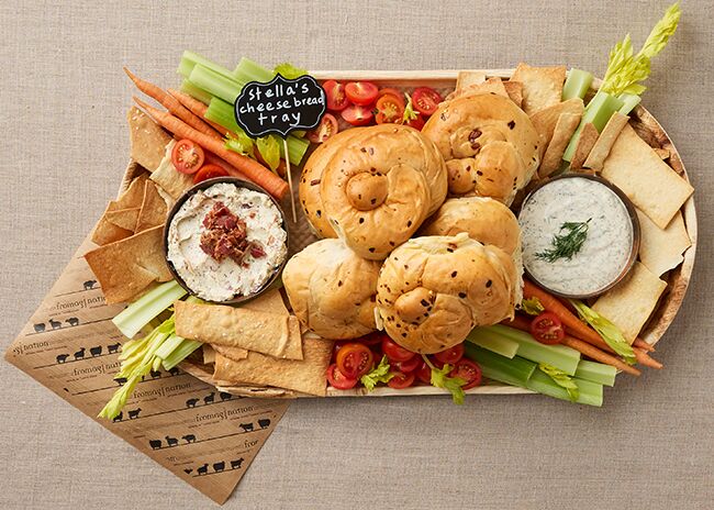 This is a bold and savory spread featuring Stella’s Hot & Spicy Cheese Bread Minis and Stella’s Artisan Flatbread Crisps, served with housemade bacon blue cheese dip, housemade ranch, fresh celery, carrots, and cherry tomatoes for the perfect balance of indulgent and crisp.