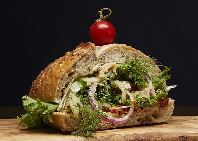 Ingredients: Housemade hummus, fennel apple slaw, red onion, housemade parsley vinaigrette on focaccia bread.
